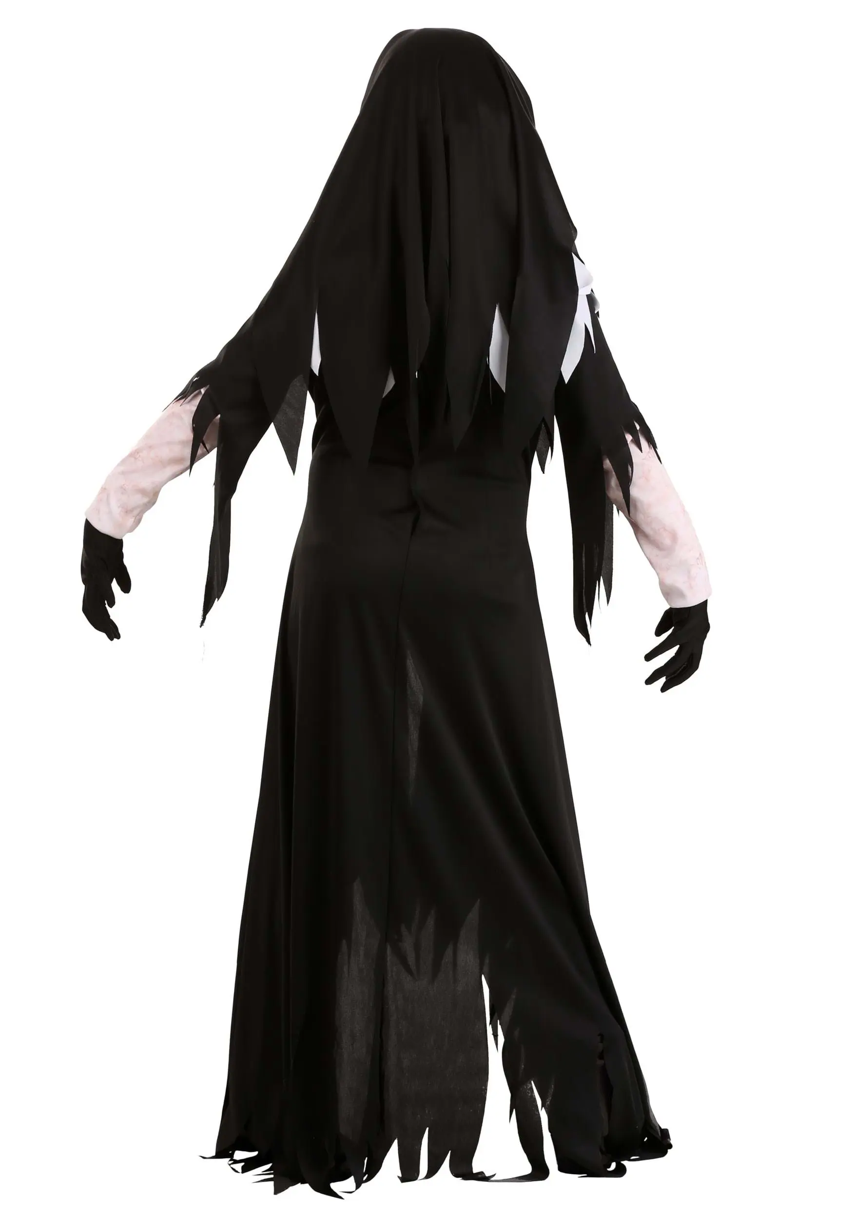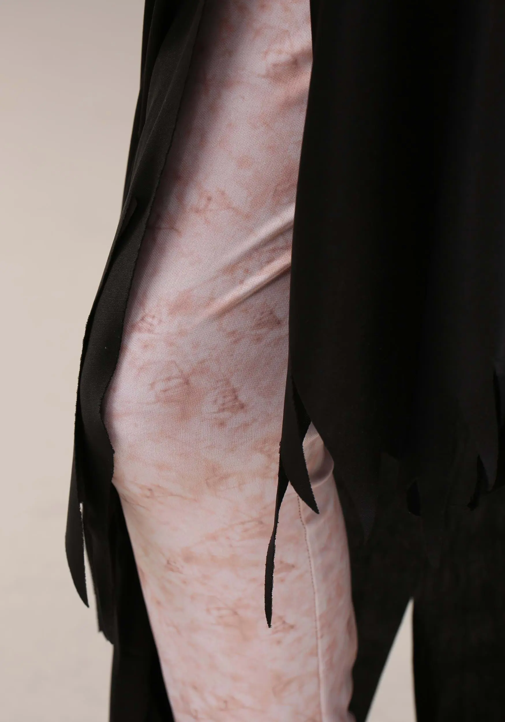 - Dress has double sleeves-short jagged black sleeves over full-length flesh-toned sleeves