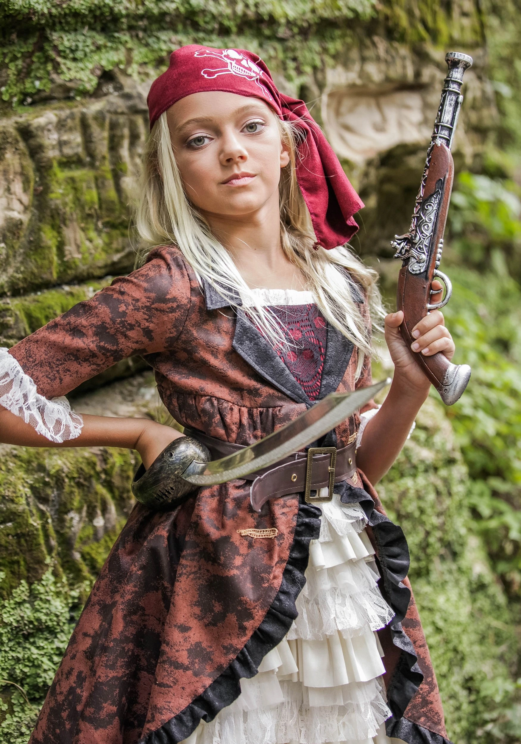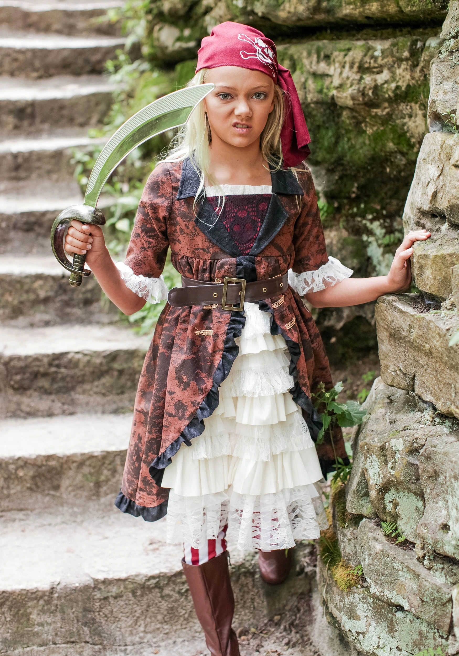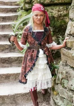 This stylish costume riffs on classic pirate themes, and creates a look that any little lady would be proud to wear to sea. The brown faux suede dress with bodice insert gives the perfect period look while also keeping those cold nights at bay. The lacy and ivory layers keeps the look feminine while the matching brown top skirt reminds the crew that this lady is serious and has her eye keenly on her share of the treasure—and maybe some of theirs! Faux suede boot tops with a classic pirate styling flaps over the ankles and the matching belt comes in a variety of sizes to ensure optimal style and comfort. Finish the look with the maroon head scarf with pirate flag design and she’s ready to tackle every threat on the seas.