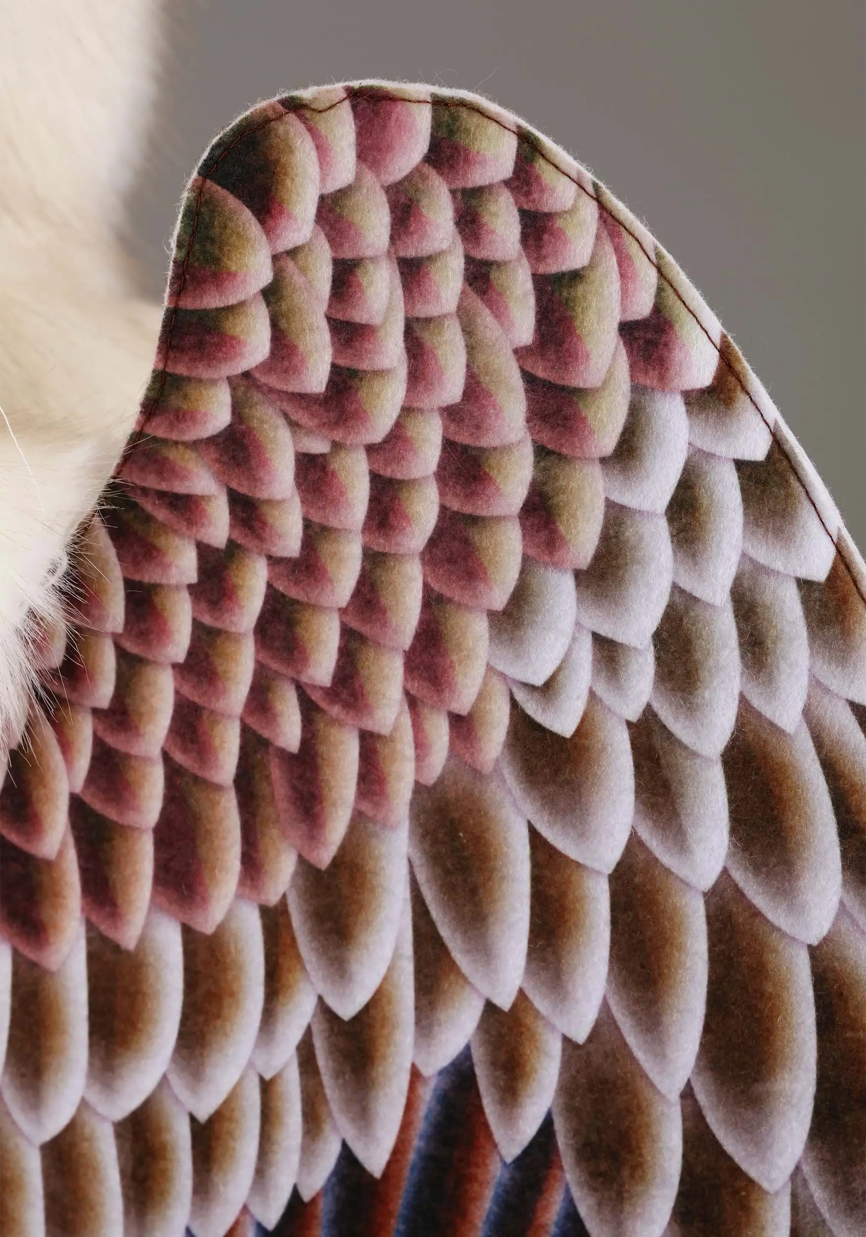 - Stiffened felt wings have elastic shoulder straps, printed feathers
