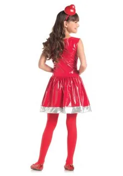 This 100% polyester knit fabric has a shiny metallic wet-look finish, and will remind you of the bubblegum machines of the old days. The sleeveless pullover dress has a full gathered skirt, and the “gumballs” in the machine are pom poms, with a clear plastic coating over the chest. The costume also comes with a shiny red “gumball” on the plastic headband. Complete the costume by adding a pair of red tights from our accessories store!