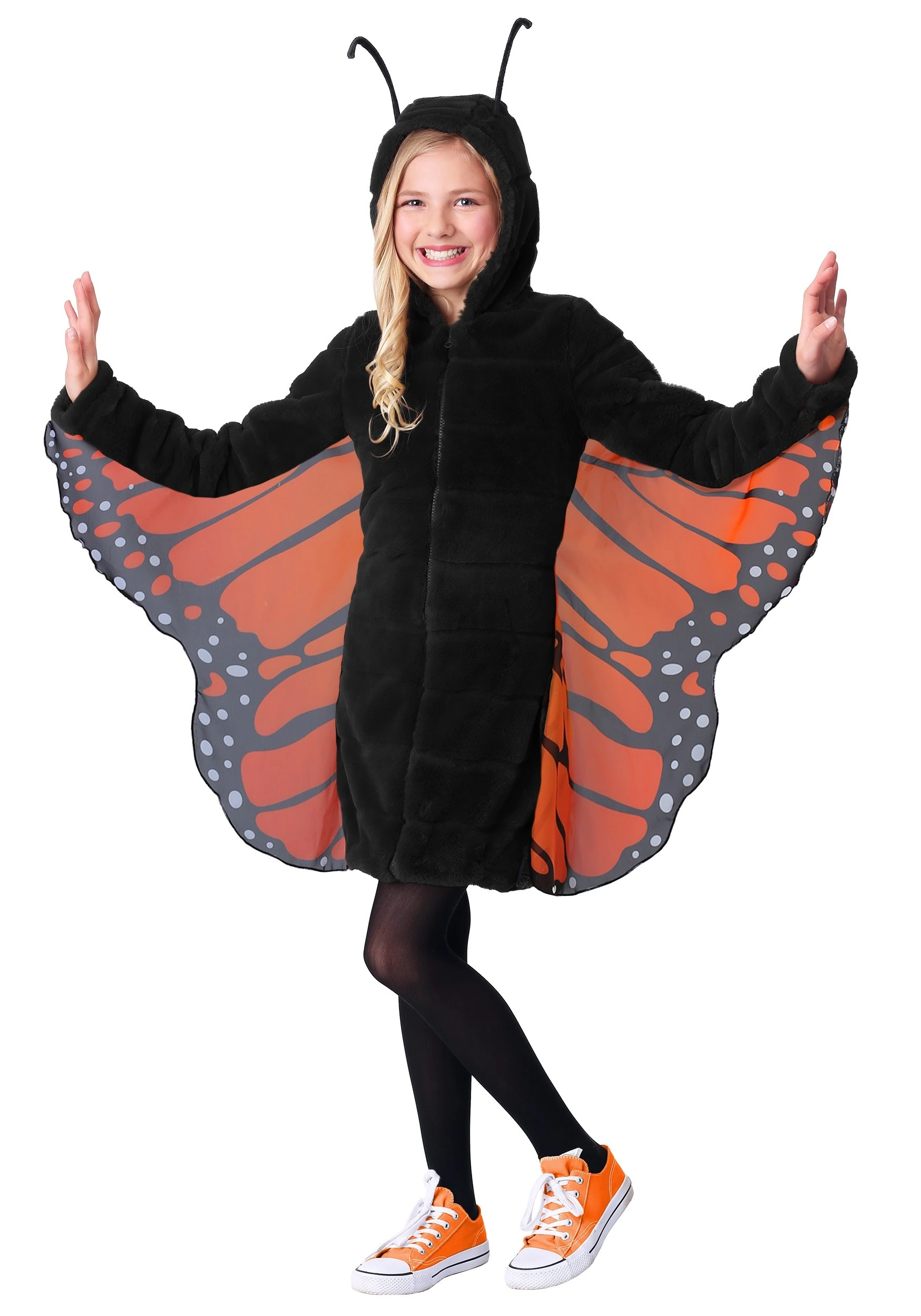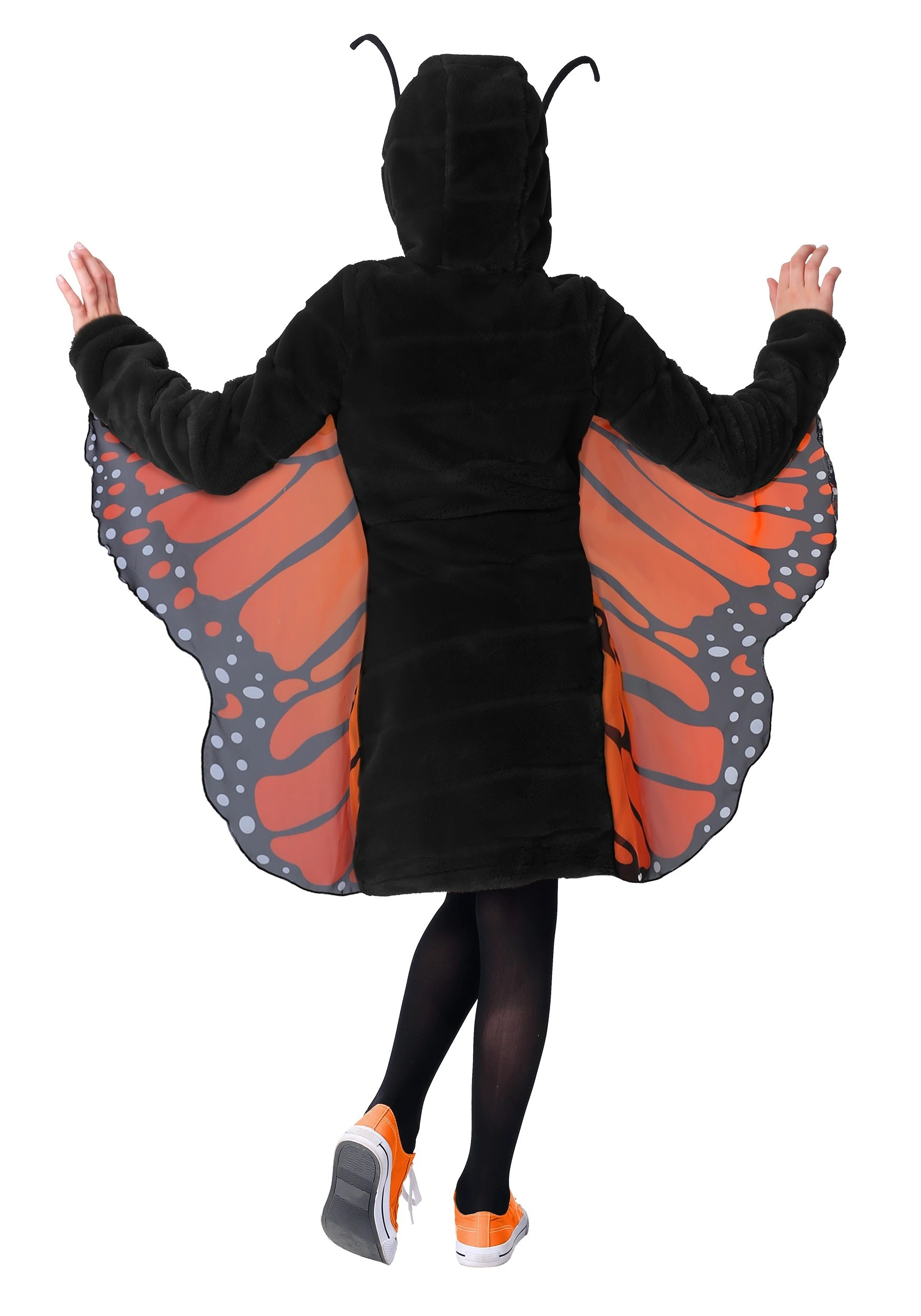 Here’s how our amazing costume team designed this garment: they cocooned themselves in a room for hours, where no one heard them stir at all. Then…days, maybe months later, they emerged, holding this darling costume, fully formed! Amazing, huh? OK, so it may not have happened exactly like that, but you get the idea. This costume started from an idea and blossomed into the beautiful butterfly you see before you. Made by Us right in our studio, this look is comprised of a cuddly, zip-up black hoodie dress with attached monarch wings. Worn over her own leggings and footwear, this is a simple look that still manages to stun—kind of like your kid!