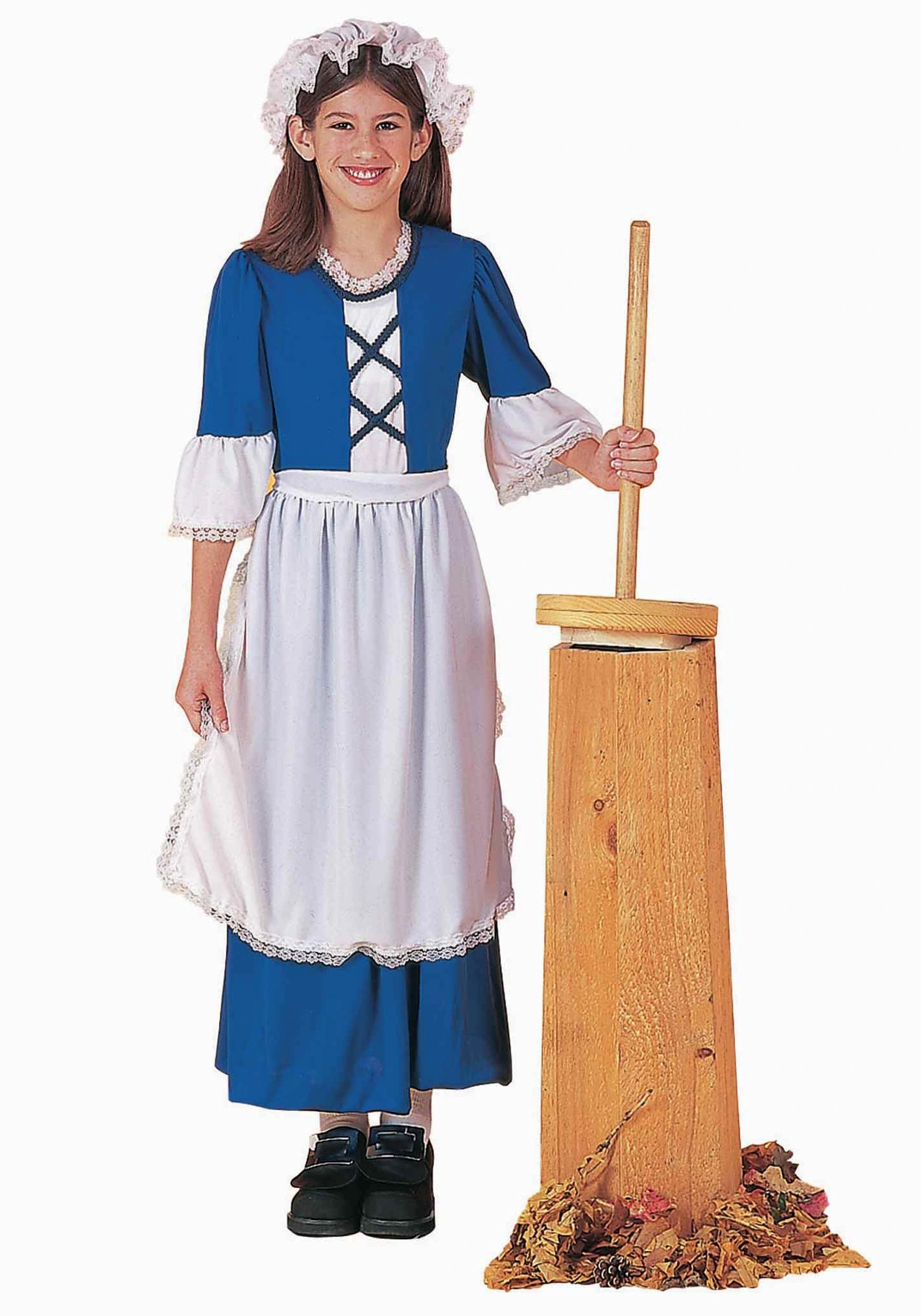 Not everyone wants to go back to the past and learn how hard it is to churn butter, but your girl is sure to have a better appreciation for Colonial times when she goes in this classic Colonial Girl costume. The base is a royal blue costume with an ankle length skirt. The top has three-quarter length sleeves with a white wide bell finish. The bodice has faux corset detailing and a lace edging around the neck. Finish it off with the lace-edged apron and traditional white hat and the look will be complete. The role will be all hers when she gets this costume for costume play or a historical recreation!