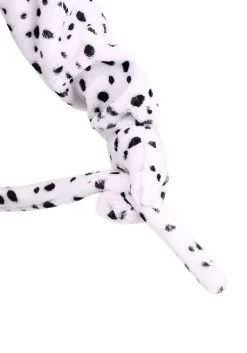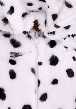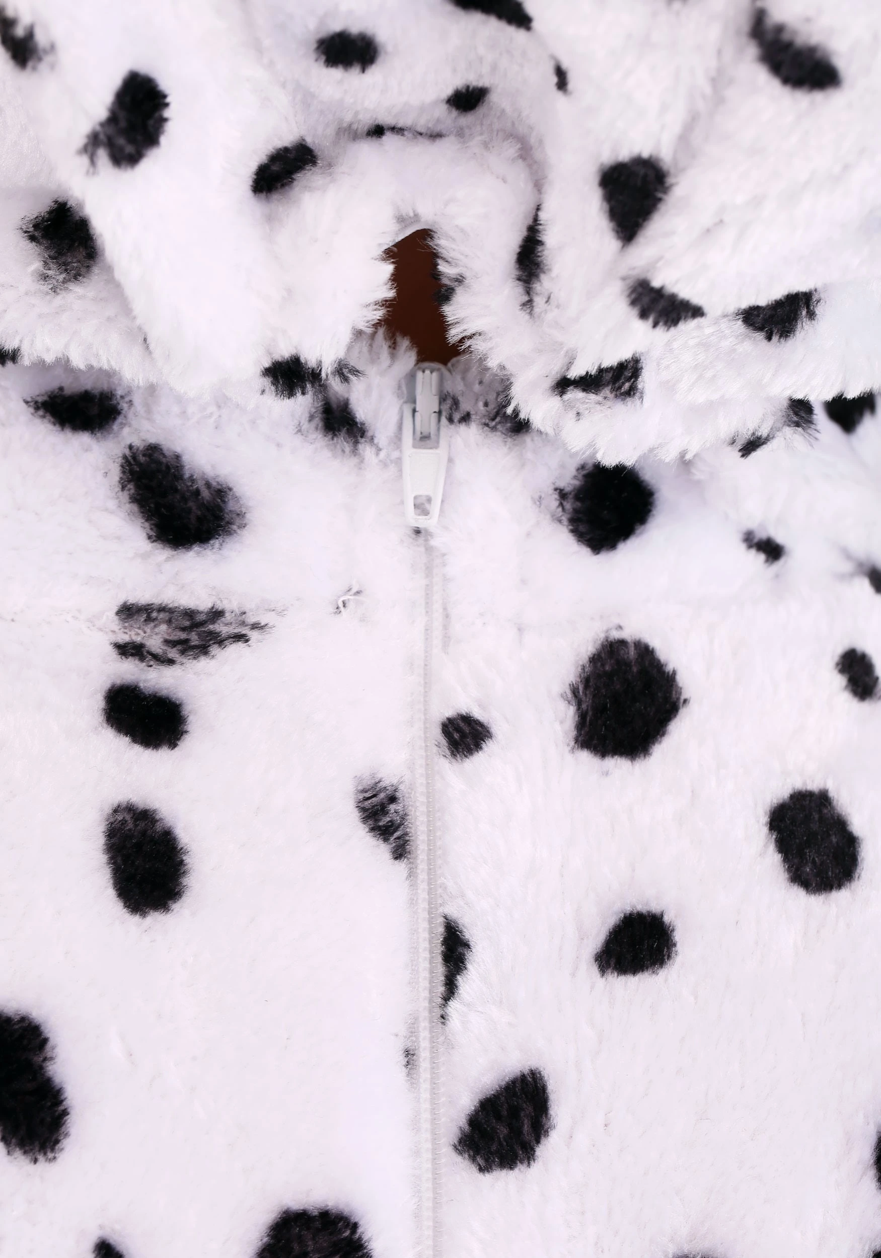 - Black-spotted white fur jumpsuit has stuffed tail & back zipper