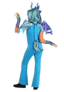 Made exclusively by us, this dragon costume keeps the silhouette simple and easy to wear, while the details and craftsmanship make it a total standout. The sleeveless jumpsuit has flared legs and comes with matching wrist cuffs in the same iridescent-blue hue. Dramatic dragon scales detail the whole outfit, as do purple spikes and stuffed horns on the pullover hood. A stuffed dragon tail attaches to the back and shimmering opalescent wings find their place on the shoulders to complete the look!