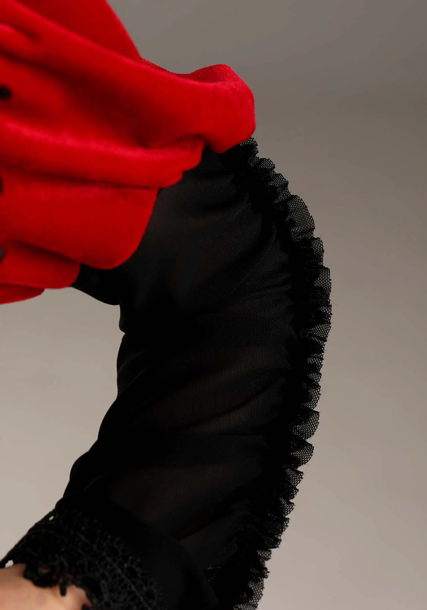 - Pullover dress has velvet bodice & upper sleeves, mesh lower sleeves