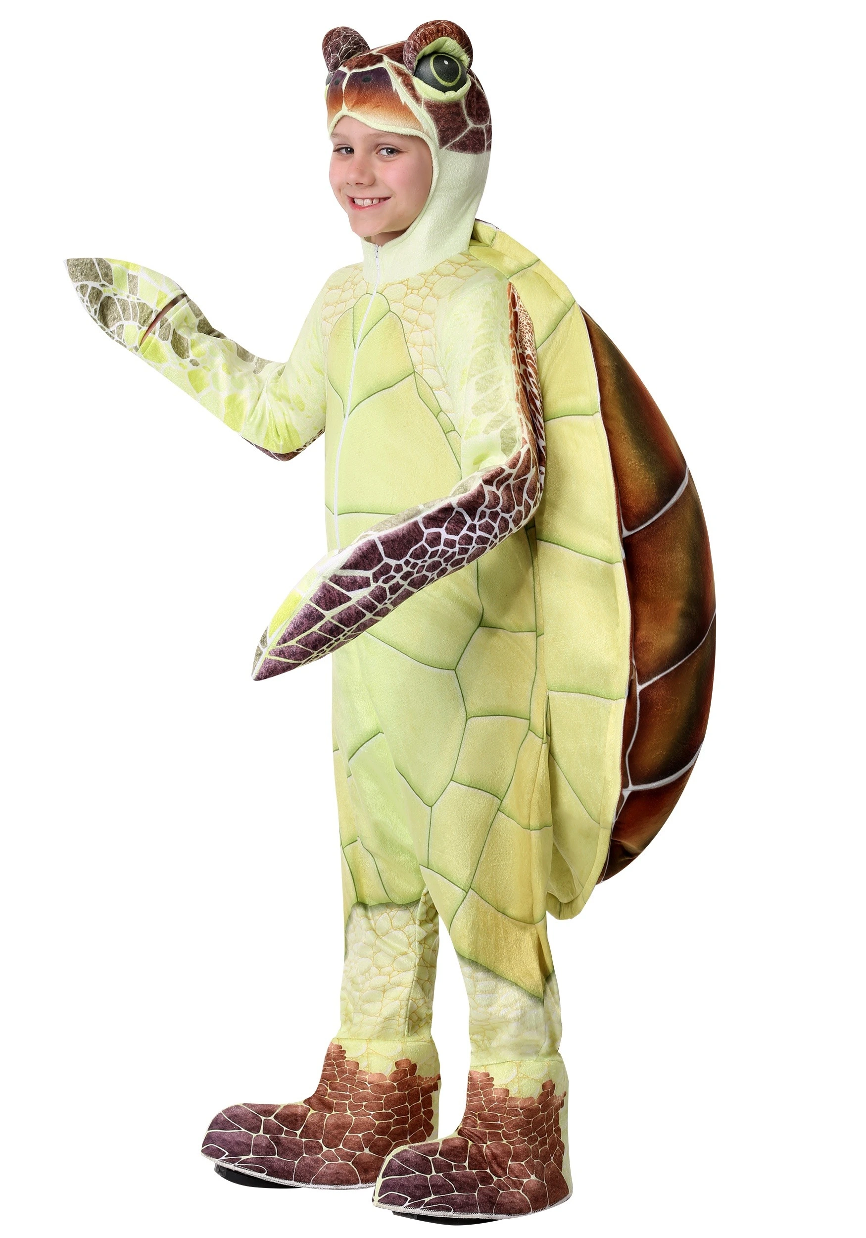 It’s easy for your child to step into a chill state of mind with this Made-By-Us sea turtle costume. Our designers and graphic artist put together this unique bodysuit with an intricate scale and shell pattern. The light green patterned belly is topped with a deeply colored shell with natural tones that you’d find while scuba diving with these nautical reptiles. It’s easy to transform into this chill oceanic creature. The jumpsuit zips up the front. The suit also has an attached turtle head hood, flippers that can fold over your child’s hands, and boot covers that hide any shoes your kiddo might be wearing.