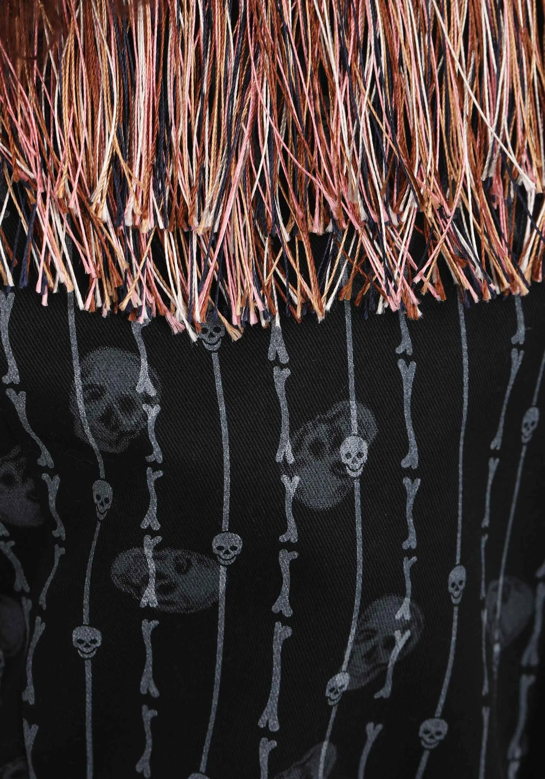 - Skull patterned jacket w/ fringe along the collar and lapels and skull front closure